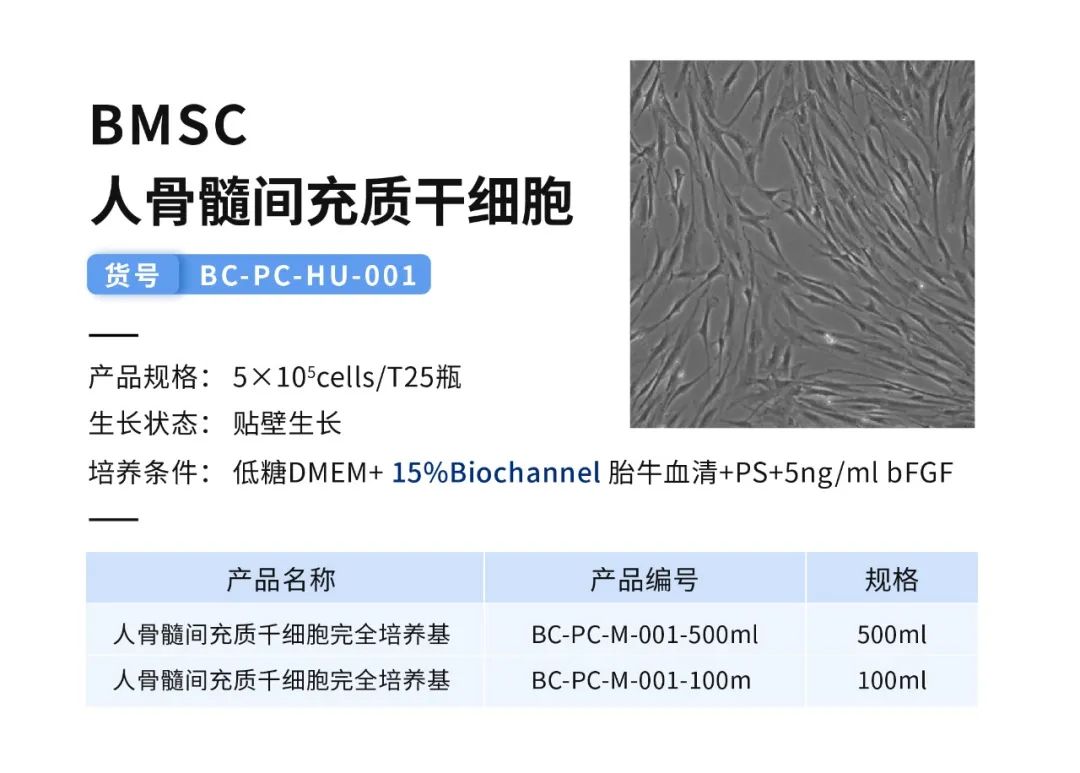 细胞简介:人骨髓间充质干细胞(BMSC)分离自骨髓;骨髓是机体的造血组织,位于身体的许多骨骼内。骨髓存在于长骨(如肱骨、股骨)的骨髓腔和扁平骨(如髂骨)的稀松骨质间的网眼中,是一种海绵状的组织,能产生血细胞的骨髓略呈红色,称为红骨髓。出生时,红骨髓充满全身骨髓腔,随着年龄增大,脂肪细胞增多,相当部分红骨髓被黄骨髓取代,最后几乎只有扁平骨骨髓腔中有红骨髓。骨髓基质系统内存在的骨髓间充质干细胞是一种除造血干细胞以外的、具有高度自我更新能力和多向分化潜能的干细胞,可以向骨、软骨、肌组织、皮肤、脂肪、神经等多种组织分化,因此可以作为组织工程中的种子细胞。在骨髓中,BMSC占骨髓有核细胞总数的0.001%-0.1%,含量极低。骨髓间充质干细胞的体外培养条件要求较高,在培养过程中,受贴壁时间、种植密度、血清含量、培养温度和培养基pH值等条件的影响。